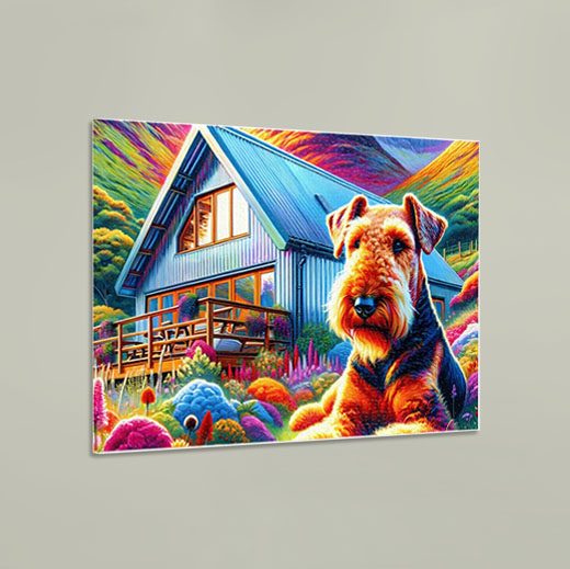 Wirehaired Pointing Griffon Off-Grid Cabin – Vibrant Mountain Scene 30″ x 20″ Foam Board Print